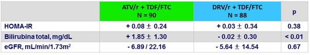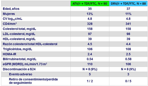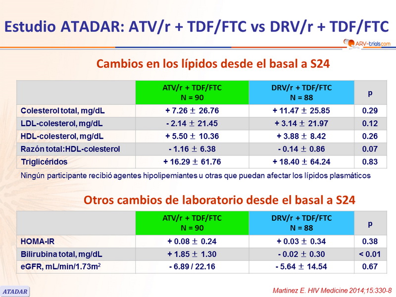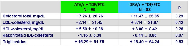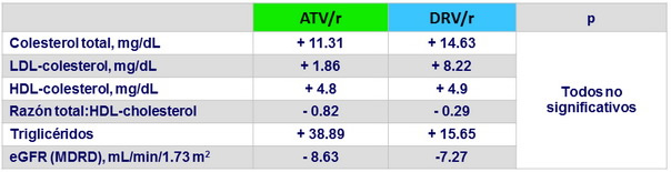 - Endpoints secundarios: media de cambio en otros parámetros lipidicos , insulino -resistencia, bilirrubina total, filtrado glomerular (MDRD), recuento de CD4 y CD8,