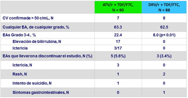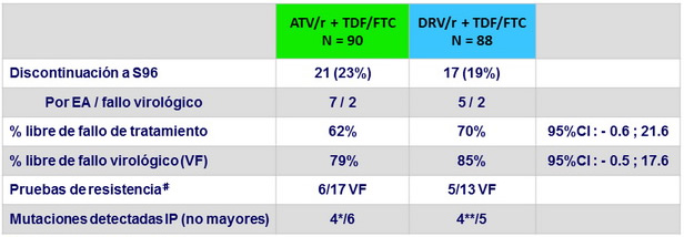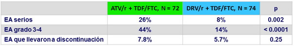 - No se observaron diferencias entre ATV/r + TDF/FTC y DRV/r