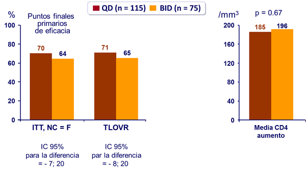 - La tasa de respuesta virológica a semana 48 (HIV RNA < 50 c/mL) fue 70% en el grupo QD grupo y 64% en el grupo BID