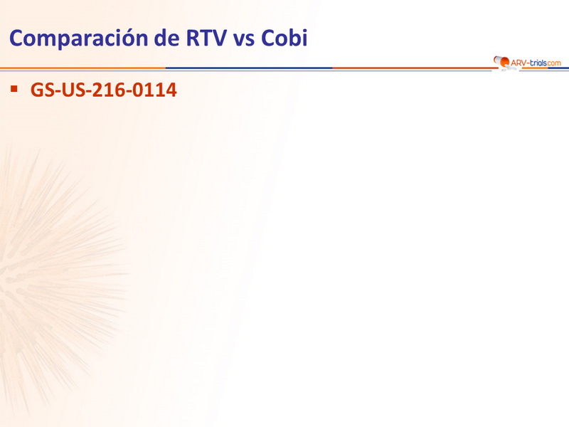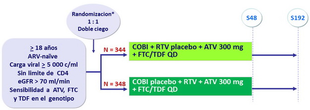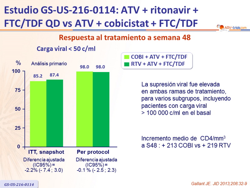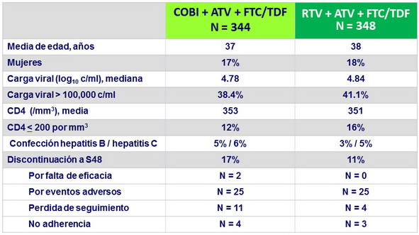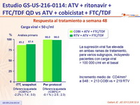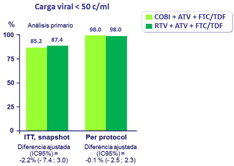 - No inferioridad de COBI comparado con RTV a S48: % carga viral < 50 c/mL por intención de tratar, análisis snapshot (limite inferior para el IC95% de la diferencia= -12%, poder= 95%)