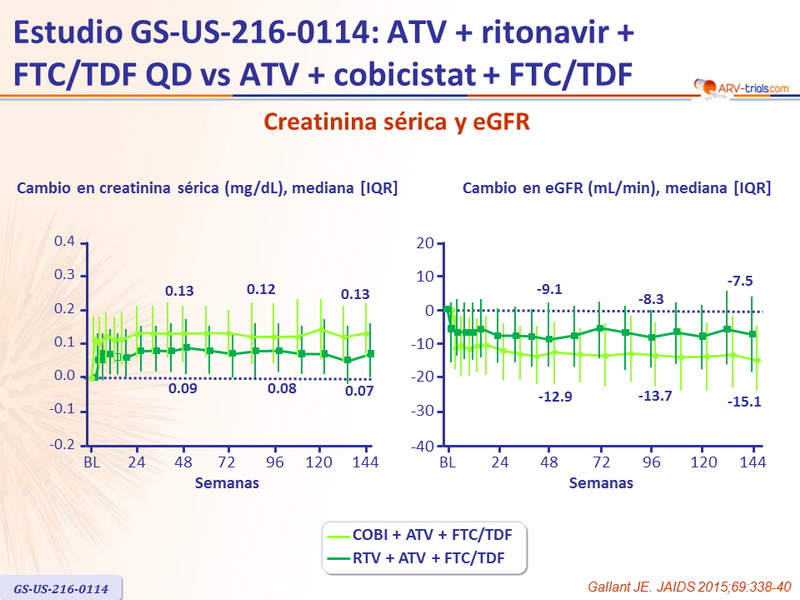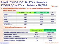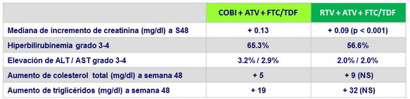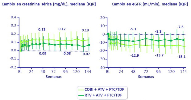 - Se registro un pequeño pero significativo incremento mayor en creatinina con COBI. El aumento de creatinina fue observado en ambos grupos, tan temprano como semana 2, con pico a semana 8, y estabilización a lo largo de 144 semanas