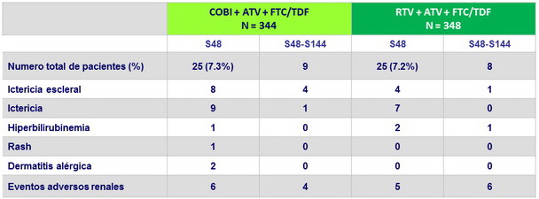- Discontinuación por eventos renales fue 2.9% en el grupo COBI y 3.2% en el grupo RTV a S144