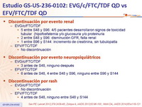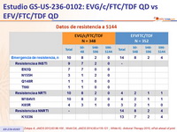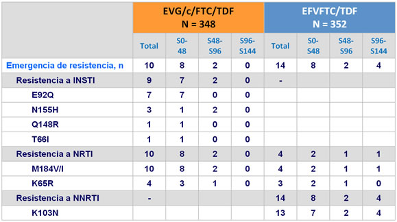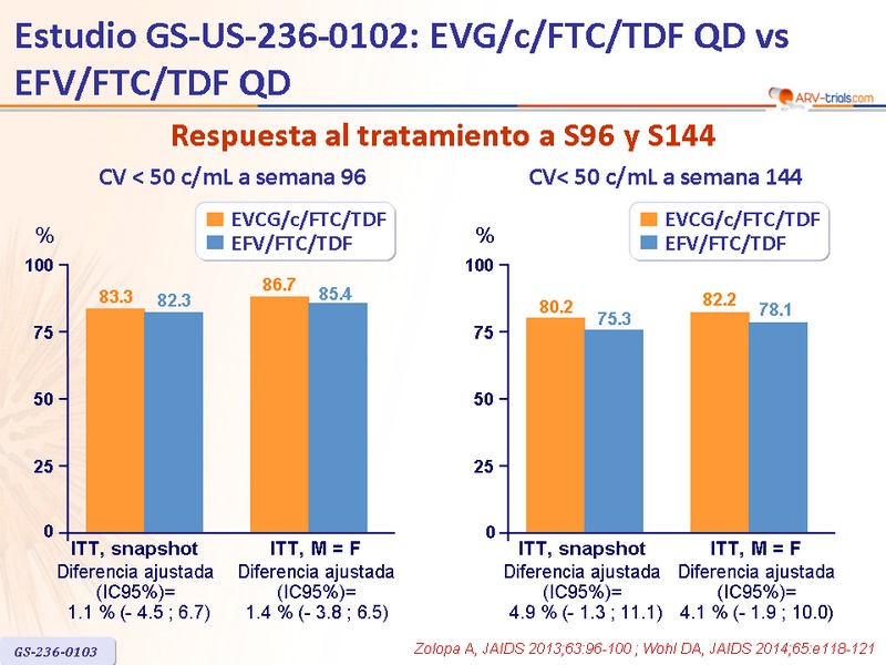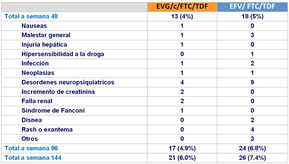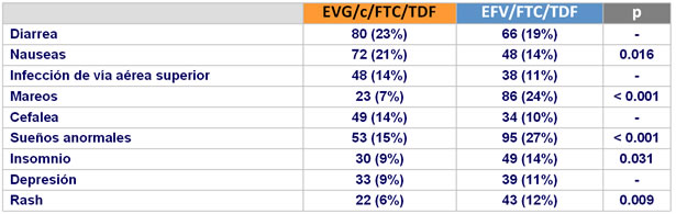 - La incidencia de eventos adversos fue similar excepto para EA neuropsiquiátricos y rash (mas frecuente con EFV/FTC/TDF), y nauseas (mas frecuente con EVG/c/FTC/TDF)