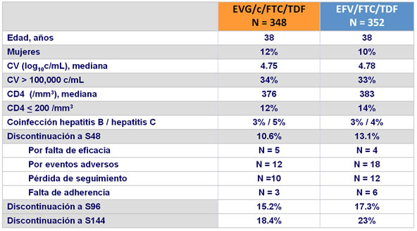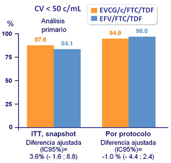 - No inferioridad de EVG/c/FTC/TDF a S48: % CV < 50 c/mL por intención de tratar, análisis snapshot (margen inferior de IC95% de dos colas para la diferencia= -12%, poder= 95%)