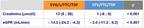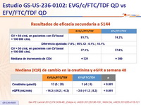 - La mediana de incremento de la creatinina con disminución de la tasa de filtrado glomerular fue mas pronunciado con EVG/c/FTC/TDF