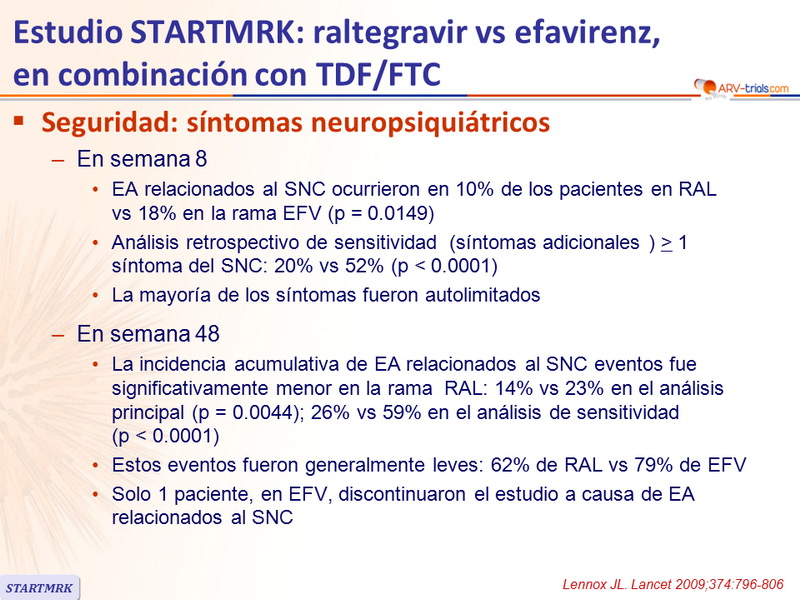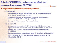 - EA relacionados al SNC ocurrieron en 10% de los pacientes en RAL vs 18% en la rama EFV (p = 0.0149)