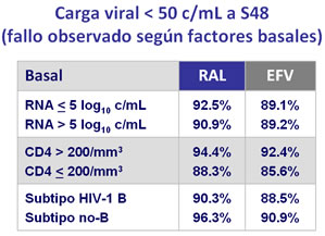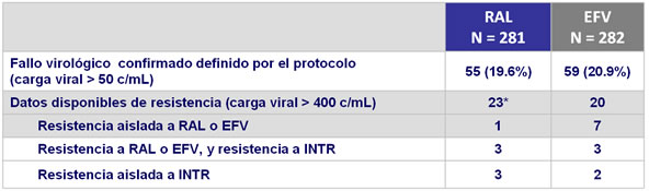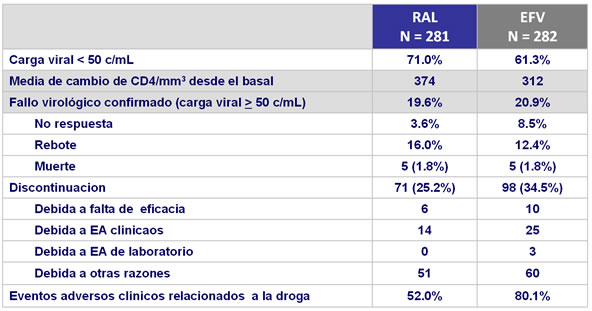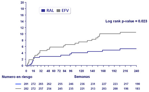 - A 48 semanas de tratamiento, RAL fue no inferior a EFV, en combinación con TDF/FTC. La no inferioridad virológica de RAL fue confirmada a S24. RAL fue superior a EFV para el resultado virológico a semana 240