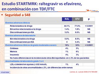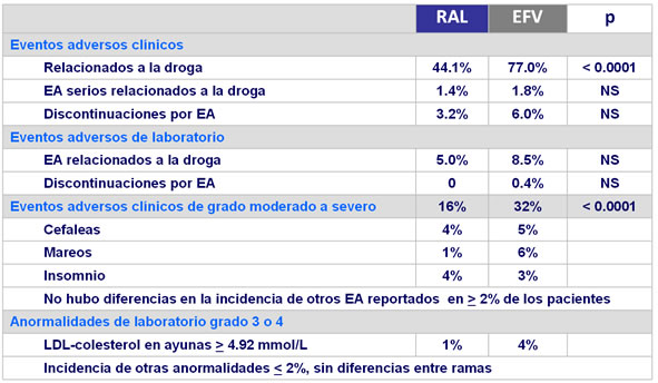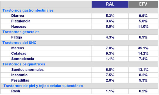 - RAL se asocio significativamente con menos eventos adversos en general y los relacionados con la droga, así como con eventos del SNC que con EFV