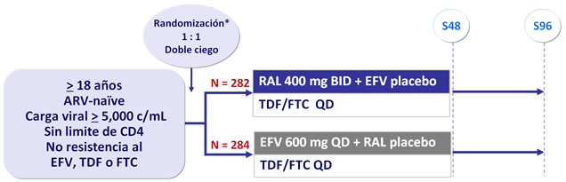 *La randomización fue estratificada por carga viral (≤ o > 50,000 c/mL) basal y coinfección con hepatitis B