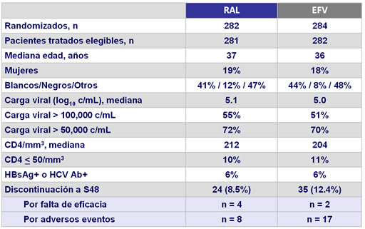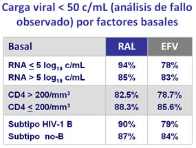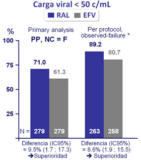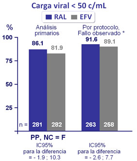 - No inferioridad de RAL vs EFV: % carga viral < 50 c/mL por protocolo, abandono= fallo (margen inferior del IC95% con 2 colas = - 12%, poder = 90%)