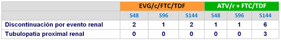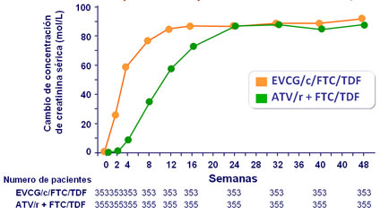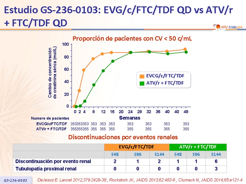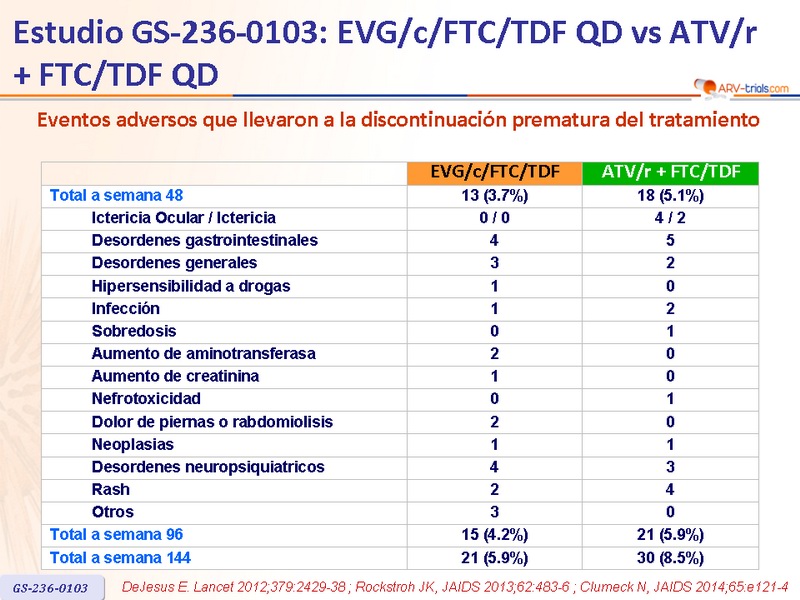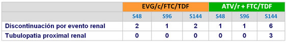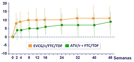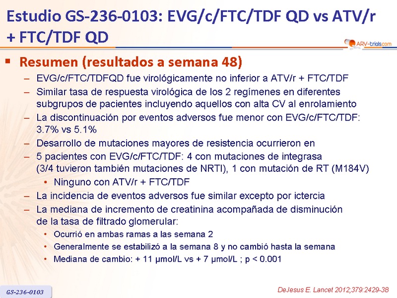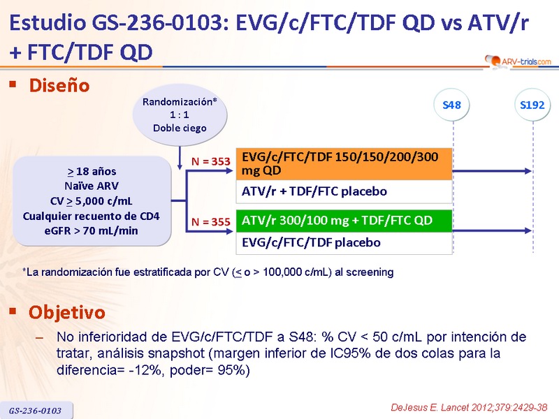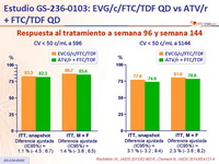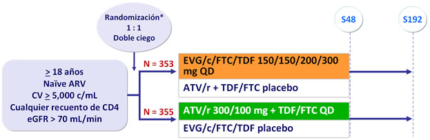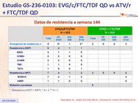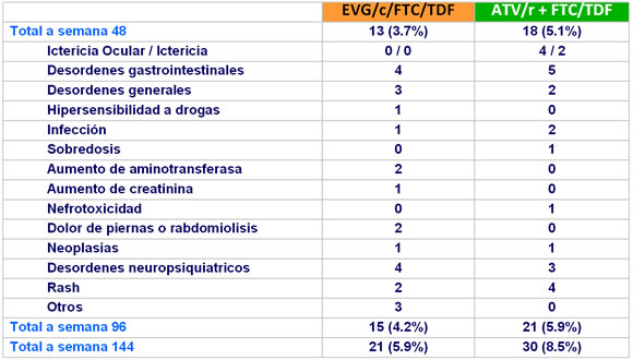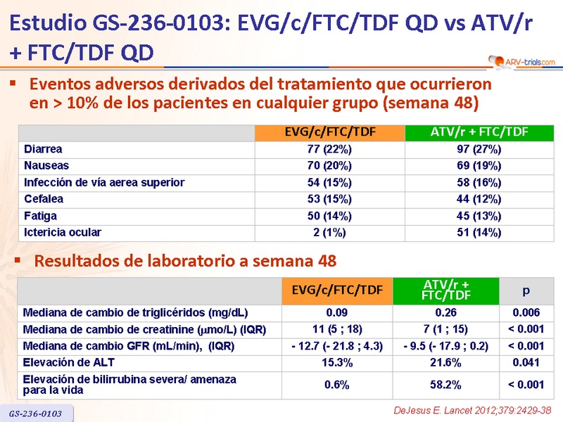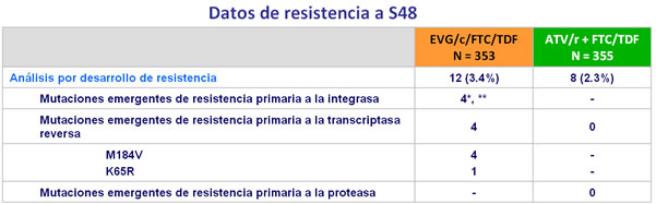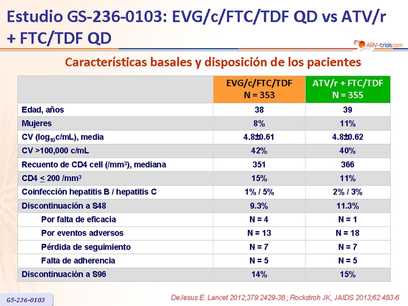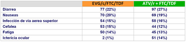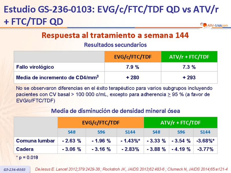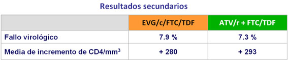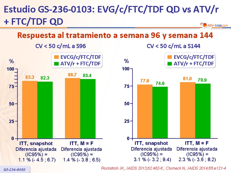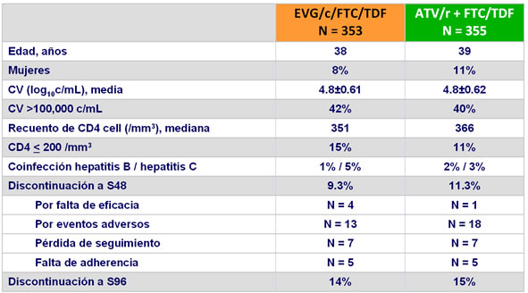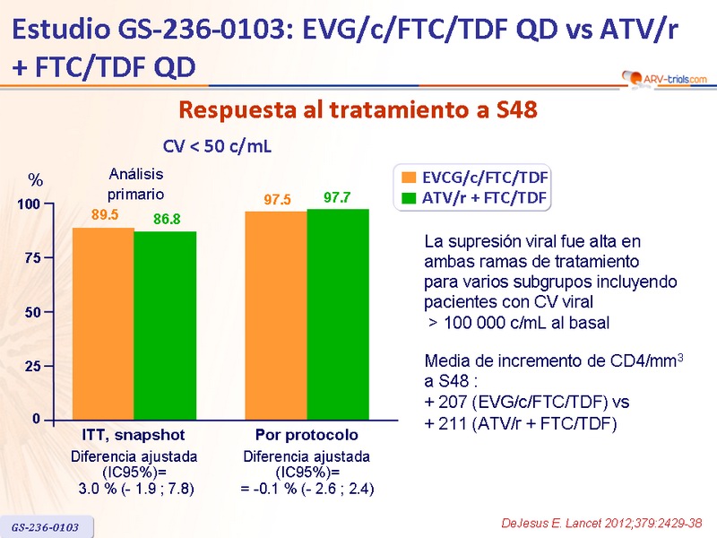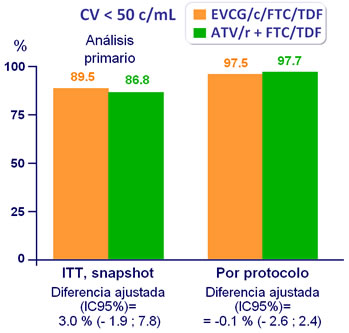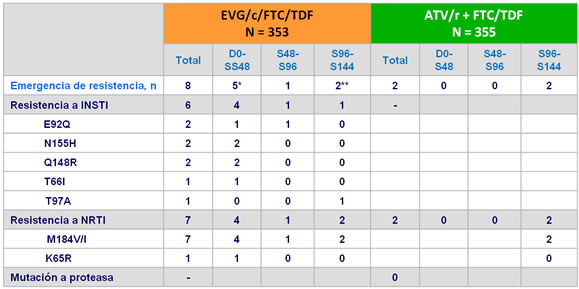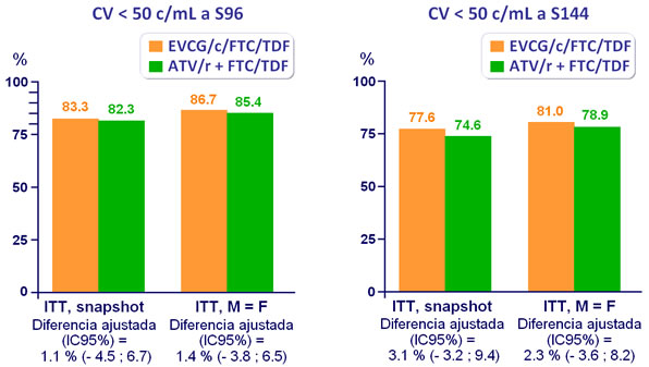 No se observaron diferencias en el éxito terapéutico para varios subgrupos incluyendo pacientes con CV basal > 100 000 c/mL, excepto para adherencia > 95 % (a favor de EVG/c/FTC/TDF)