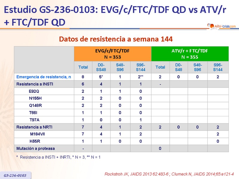 * Q148R, N = 2, N155H, N = 1, T66I + E92Q + N155H, N = 1 ; ** 1 presentaba también M184V + K65R y2 M184V