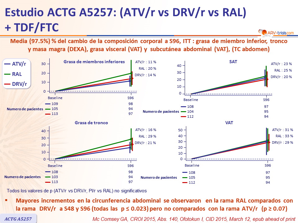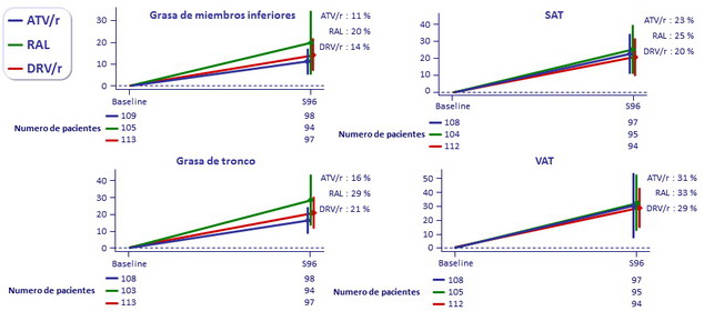 Mayores incrementos en la circunferencia abdominal se observaron en la rama RAL comparados con la rama DRV/r a S48 y S96 (todas las p ≤ 0.023) pero no comparados con la rama ATV/r