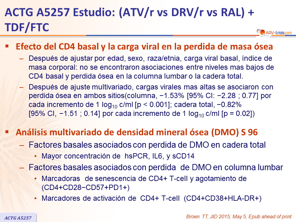 - Después de ajustar por edad, sexo, raza/etnia, carga viral basal, índice de masa corporal: no se encontraron asociaciones entre niveles mas bajos de CD4 basal y perdida ósea en la columna lumbar o la cadera total.