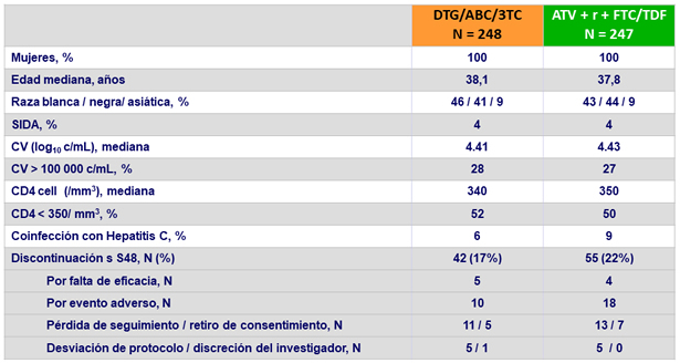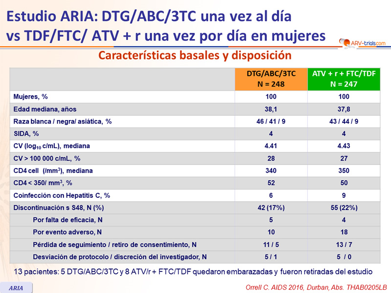 13 pacientes: 5 DTG/ABC/3TC y 8 ATV/r + FTC/TDF quedaron embarazadas y fueron retiradas del estudio
