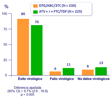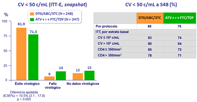 - No inferioridad de DTG/ABC/3TC a S48: % CV < 50 c/ mL por intención de tratar, análisis snapshot (margen inferior de IC95% de dos colas para la diferencia = - 12%)