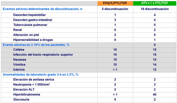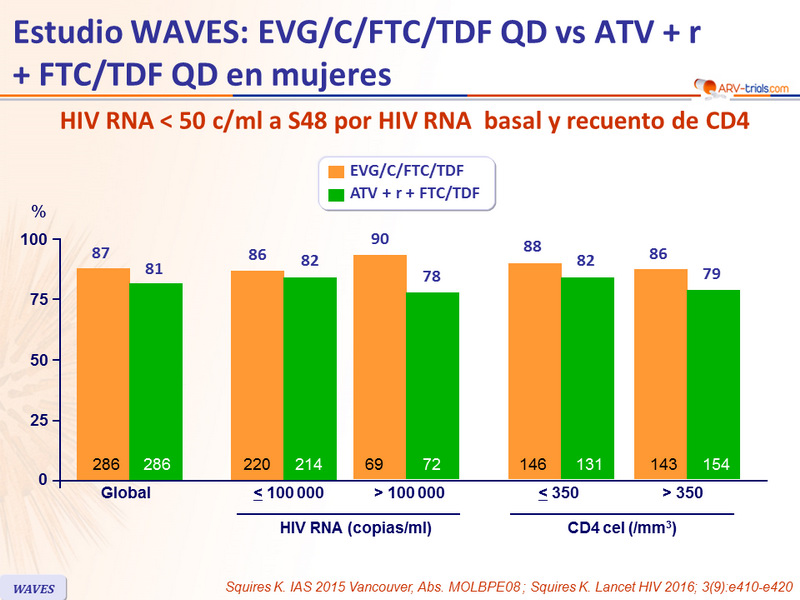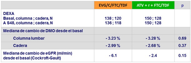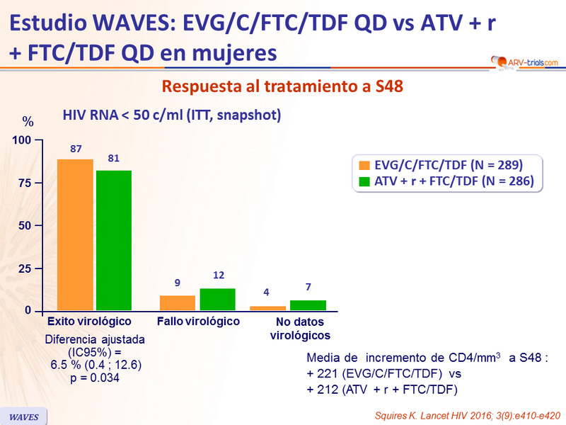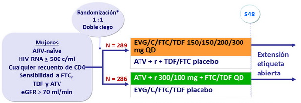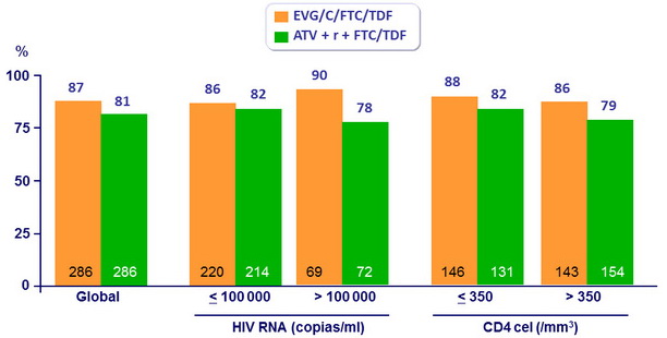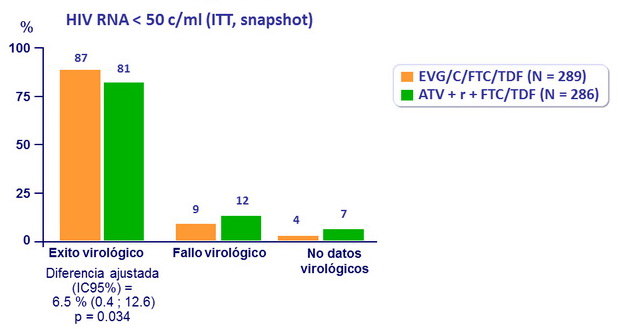- No inferioridad de EVG/C/FTC/TDF a S48: % HIV RNA < 50 c/ml por intención de tratar, análisis snapshot (límite inferior de IC95% de dos colas para la diferencia = -12%)