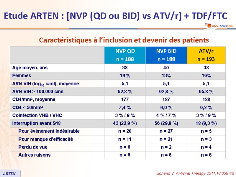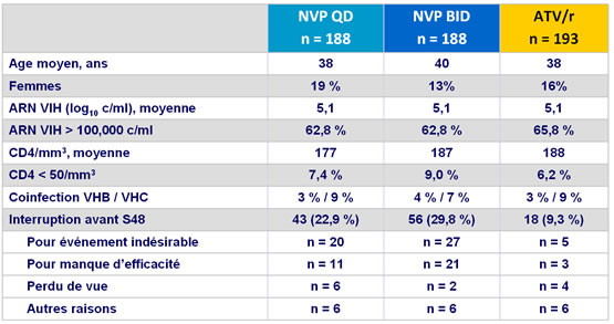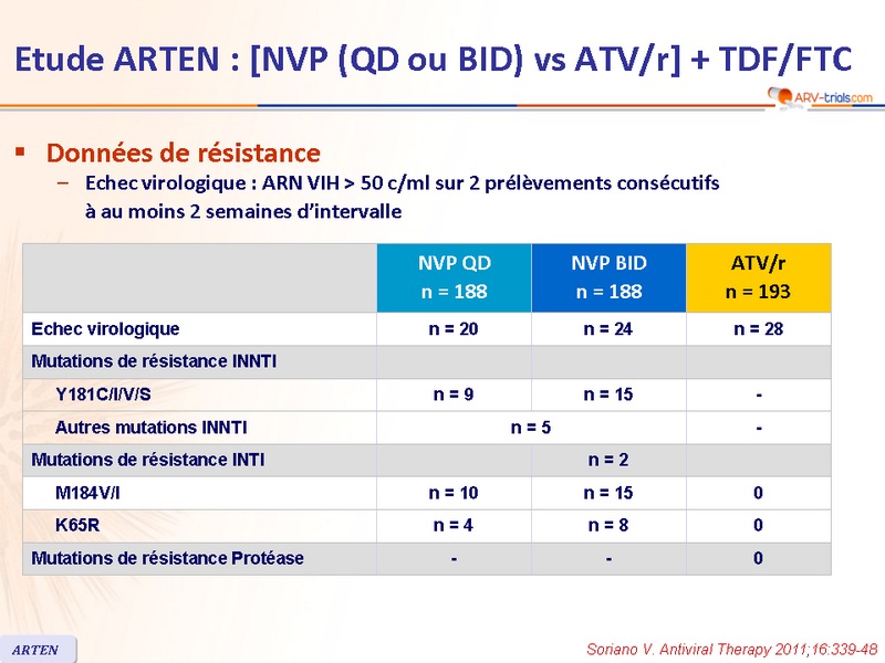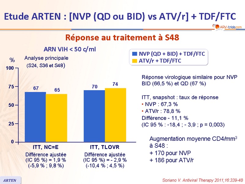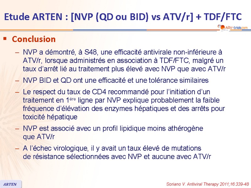 - NVP a démontré, à S48, une efficacité antivirale non-inférieure à ATV/r, lorsque administrés en association à TDF/FTC, malgré un taux d'arrêt lié au traitement plus élevé avec NVP que avec ATV/r