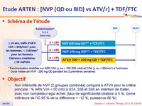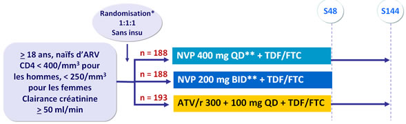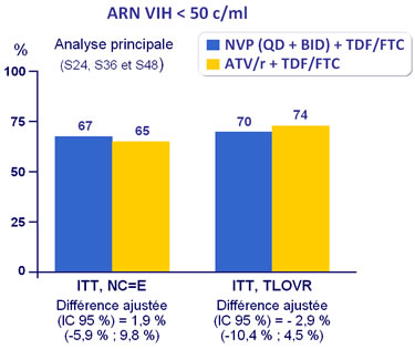 - Non infériorité de NVP (2 groupes combinés) comparé à ATV/r pour le critère principal : % ARN VIH < 50 c/ml à S24, S36 et S48 en intention de traiter, avec non compléteur égal échec (taux de significativité bilatéral à 5 %, borne inférieure de l'IC 95 % de la différence = -12 %, puissance 80 %)