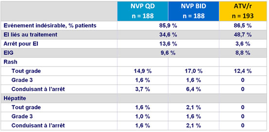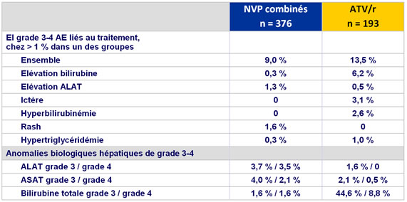 - Elévation grade 3-4 des enzymes hépatiques : 4 % NVP vs 1,5 % ATV/r