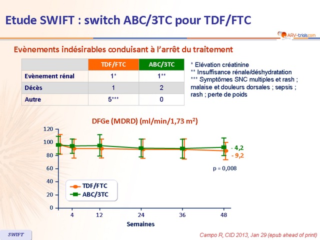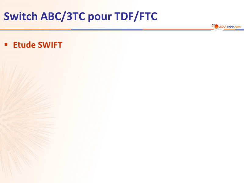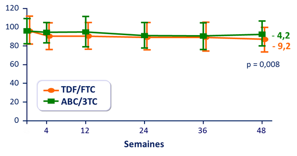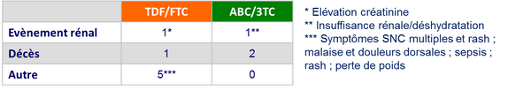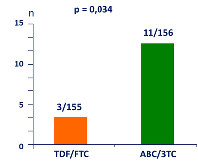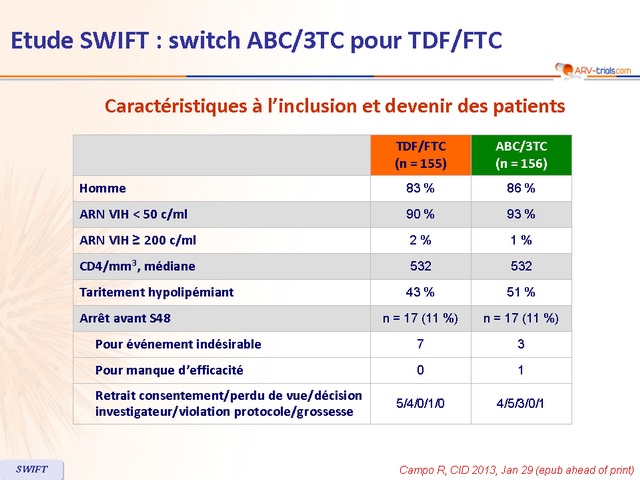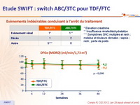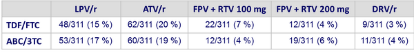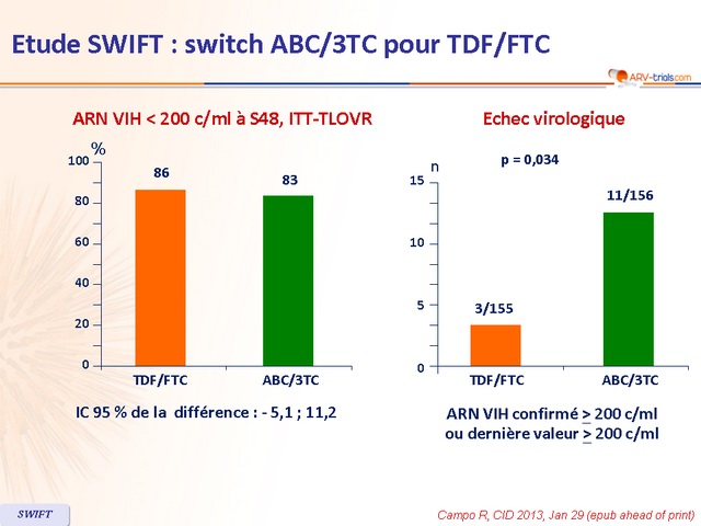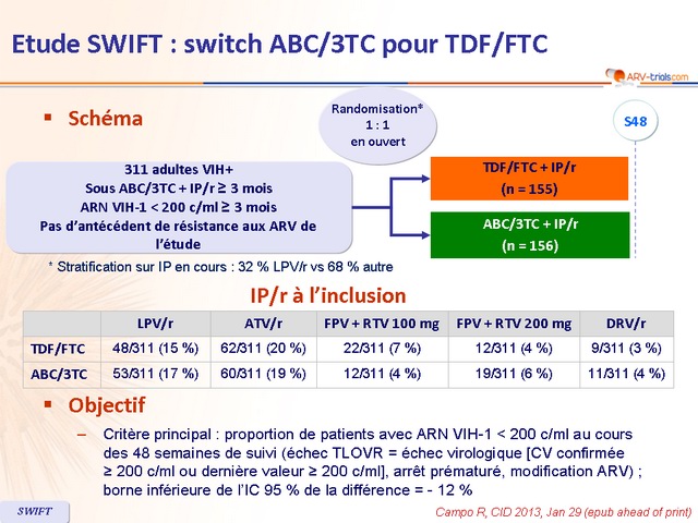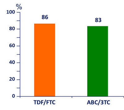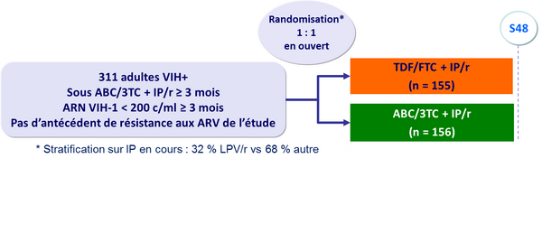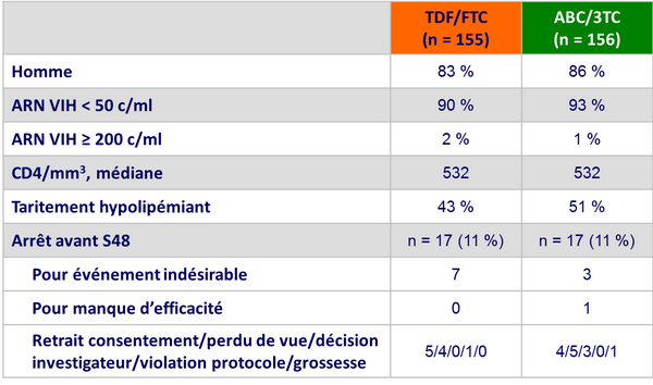 - Critère principal : proportion de patients avec ARN VIH-1 < 200 c/ml au cours des 48 semaines de suivi (échec TLOVR = échec virologique [CV confirmée ≥ 200 c/ml ou dernière valeur ≥ 200 c/ml], arrêt prématuré, modification ARV) ; borne inférieure de l’IC 95 % de la différence = - 12 %