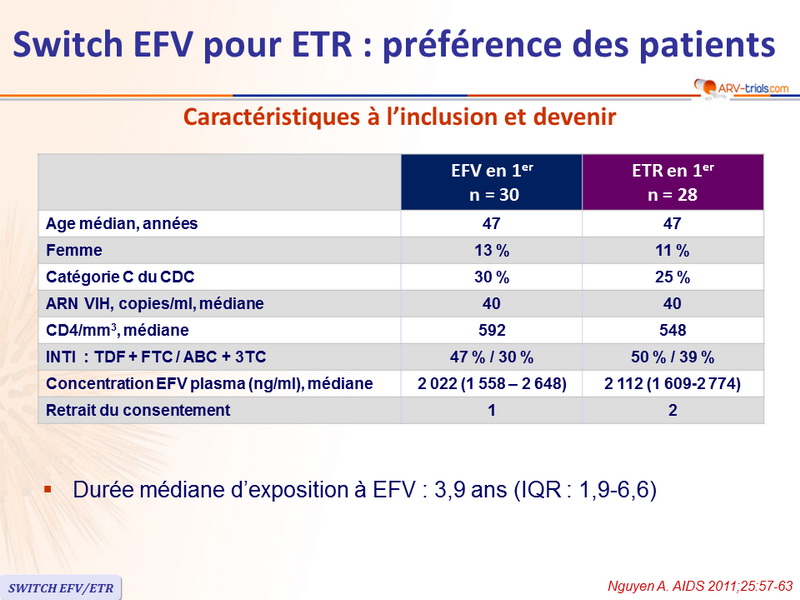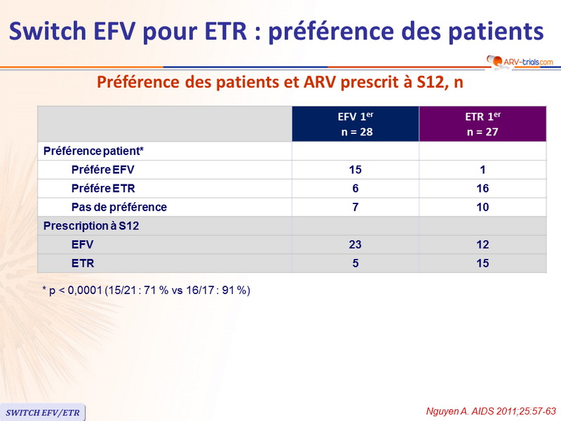 - Les patients traités par EFV au long cours ne préfèrent pas, généralement, l'ETR après un switch