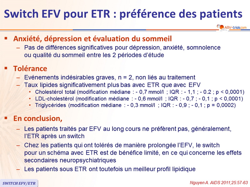 - Chez les patients qui ont tolérés de manière prolongée l'EFV, le switch pour un schéma avec ETR est de bénéfice limité, en ce qui concerne les effets secondaires neuropsychiatriques