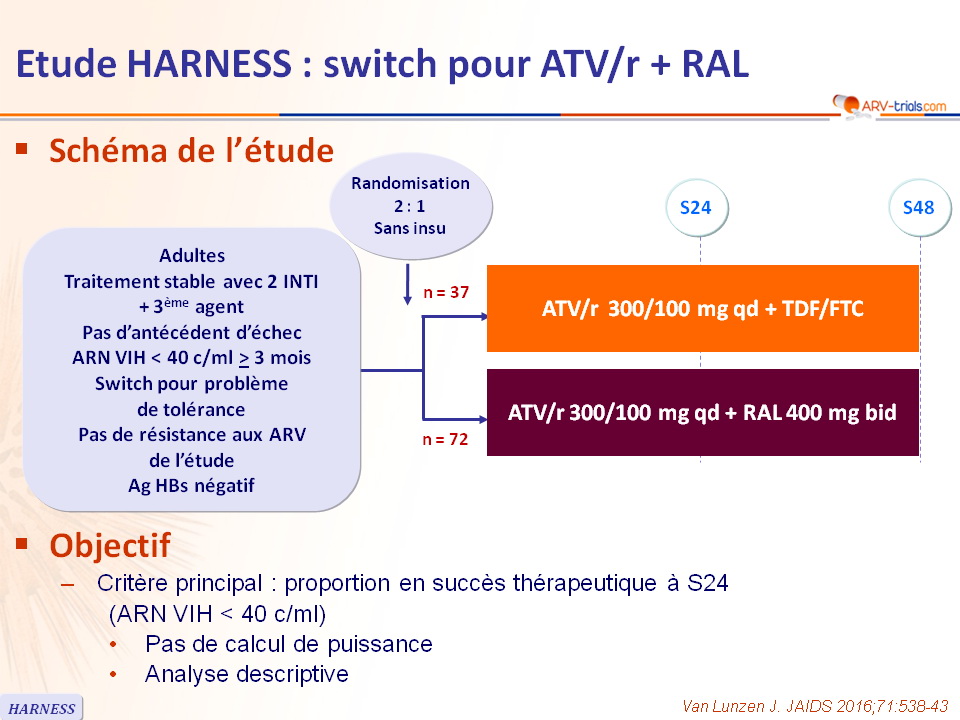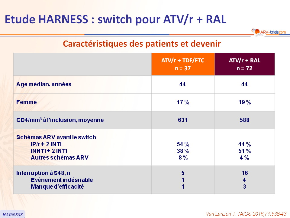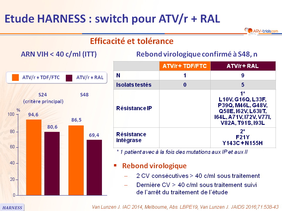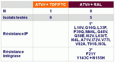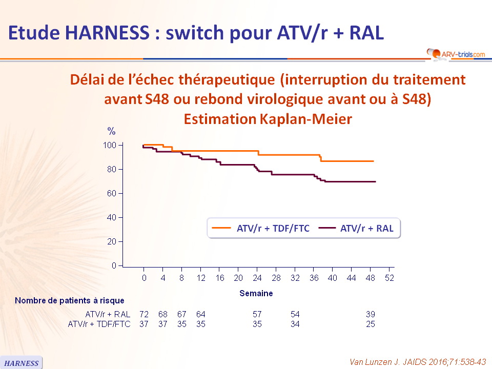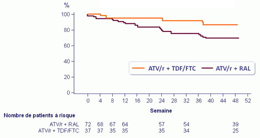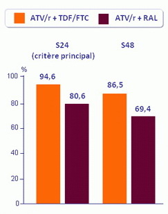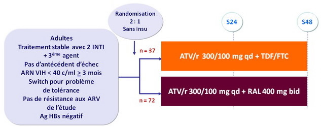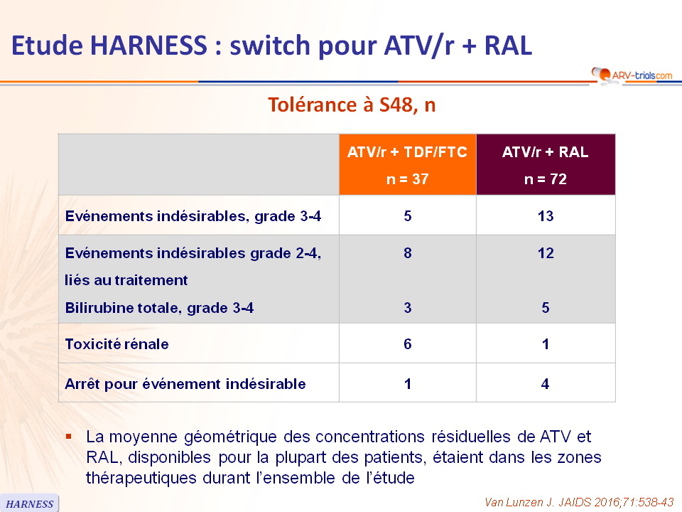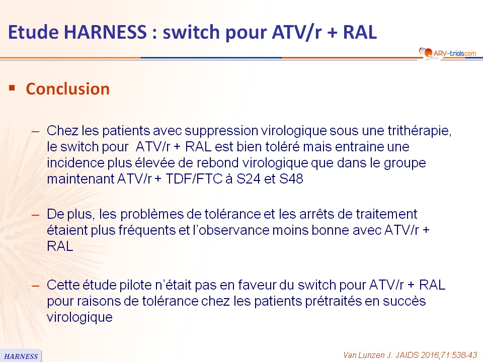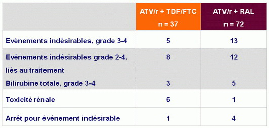- Chez les patients avec suppression virologique sous une trithérapie, le switch pour ATV/r + RAL est bien toléré mais entraine une incidence plus élevée de rebond virologique que dans le groupe maintenant ATV/r + TDF/FTC à S24 et S48