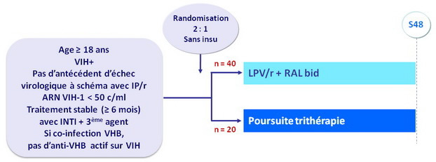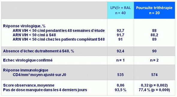 - Chez les patients avec charge virale indétectable sous trithérapie ARV, le switch pour le schéma d’épargne d’INTI associant LPV/r + RAL était similaire, pour la persistance du contrôle virologique et l’évolution immunologique, à la poursuite de la trithérapie standard