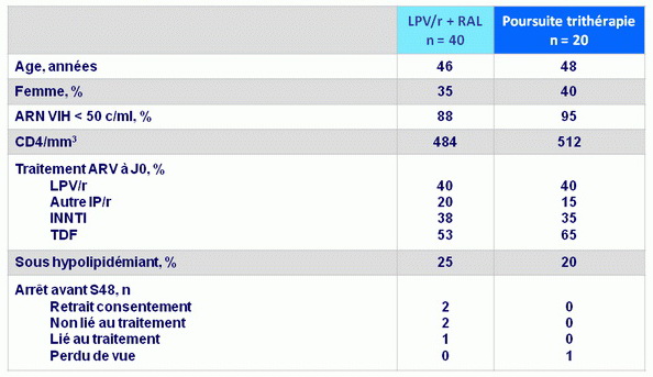 - Les événements indésirables étaient comparables entre les 2 groupes de traitement, mais les patients sous LPV/r + RAL avaient des taux de triglycérides plus élevés