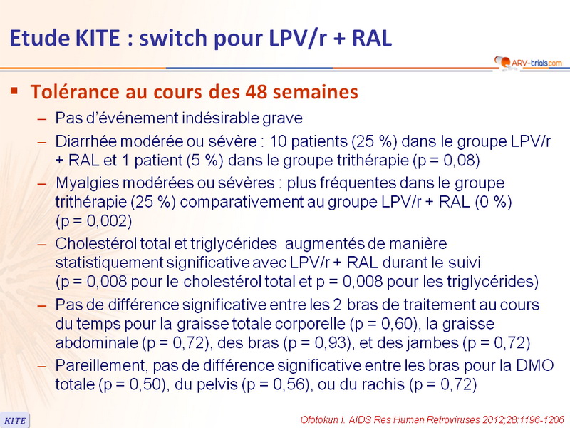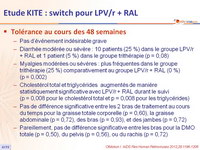 - Cholestérol total et triglycérides augmentés de manière statistiquement significative avec LPV/r + RAL durant le suivi (p = 0,008 pour le cholestérol total et p = 0,008 pour les triglycérides)