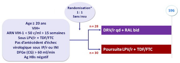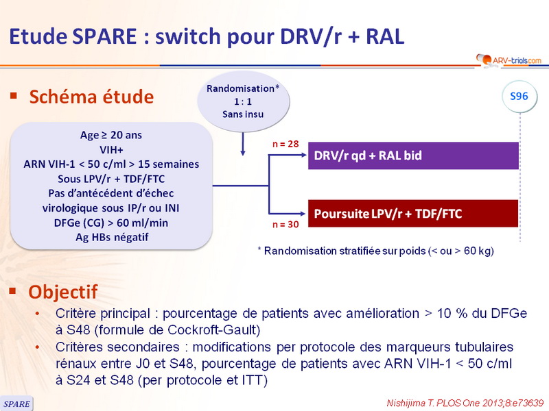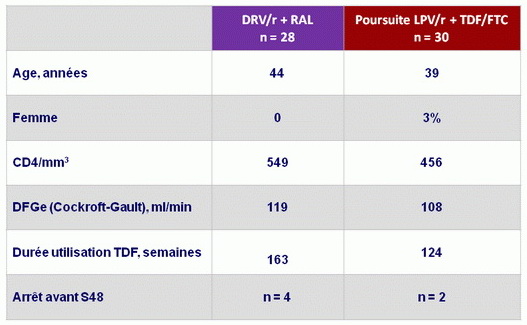 - Critères secondaires : modifications per protocole des marqueurs tubulaires rénaux entre J0 et S48, pourcentage de patients avec ARN VIH-1 < 50 c/ml à S24 et S48 (per protocole et ITT)