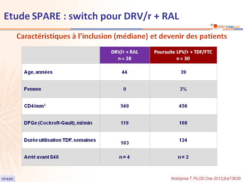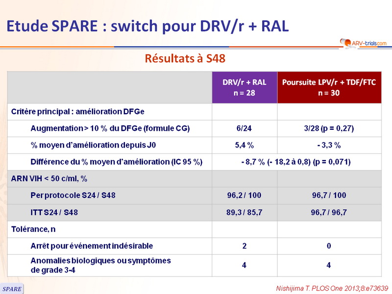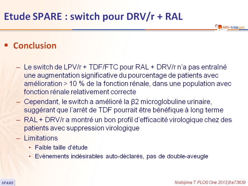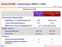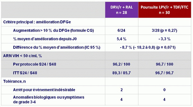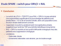 - Le switch de LPV/r + TDF/FTC pour RAL + DRV/r n’a pas entraîné une augmentation significative du pourcentage de patients avec amélioration > 10 % de la fonction rénale, dans une population avec fonction rénale relativement correcte