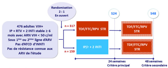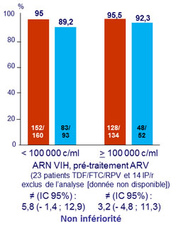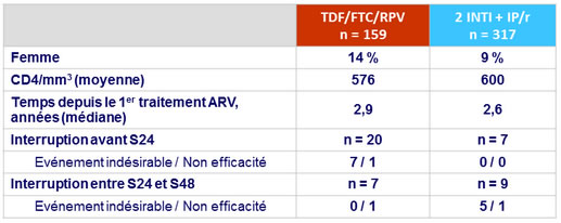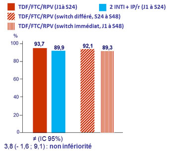 - Critère principal : non-infériorité dans la proportion de patients avec ARN VIH-1 < 50 c/ml à S24 (analyse snapshot ) ; limite supérieure de l'IC 95% de la différence = 12% Critères secondaires : proportion avec ARN VIH-1 < 50 c/ml à S48 ;