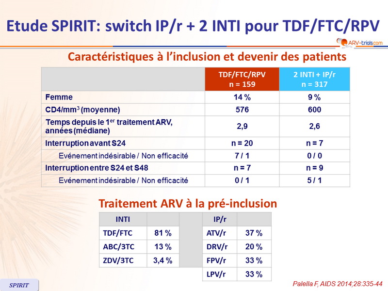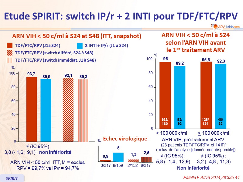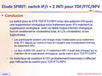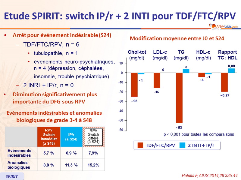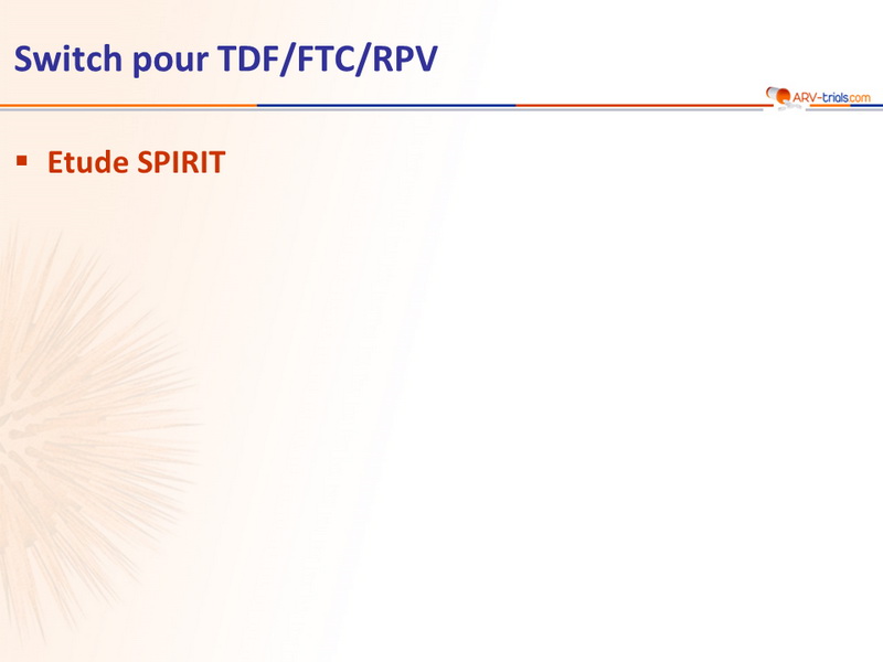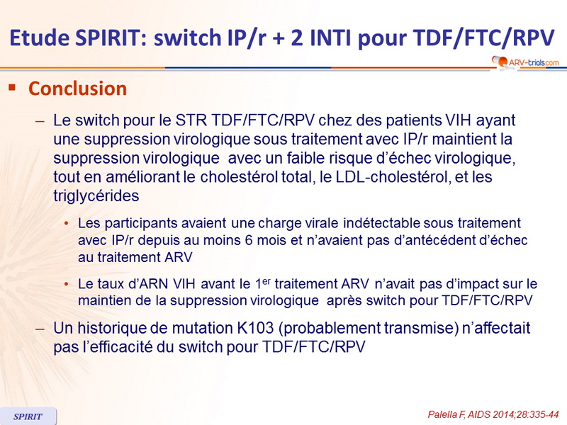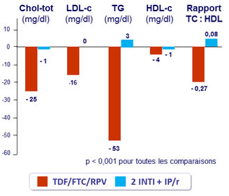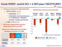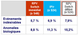 - Le switch pour le STR TDF/FTC/RPV chez des patients VIH ayant une suppression virologique sous traitement avec IP/r maintient la suppression virologique avec un faible risque d'échec virologique, tout en améliorant le cholestérol total, le LDL-cholestérol, et les triglycérides