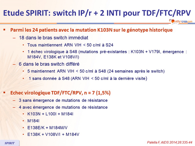 - Un historique de mutation K103 (probablement transmise) n'affectait pas l'efficacité du switch pour TDF/FTC/RPV