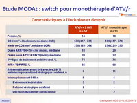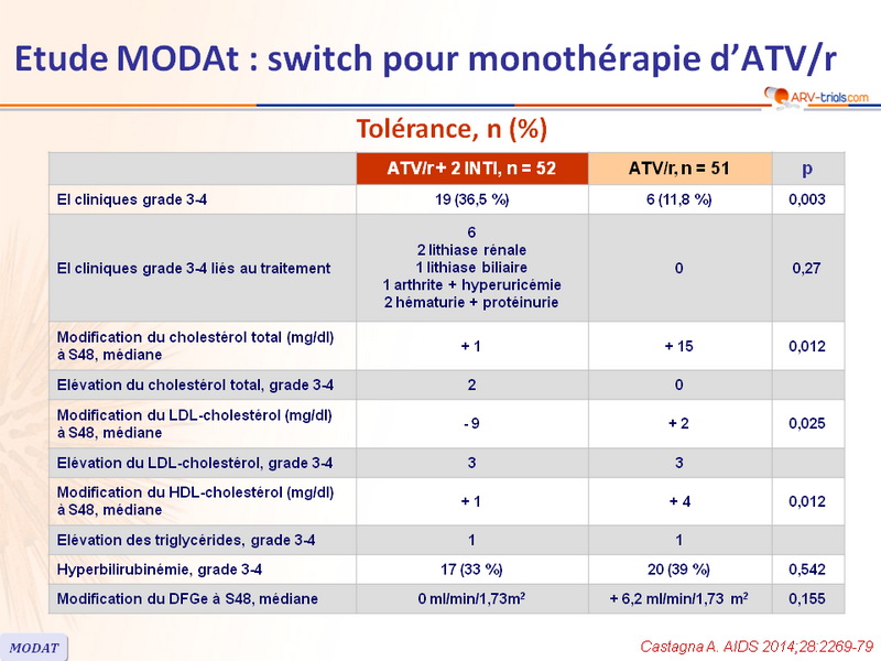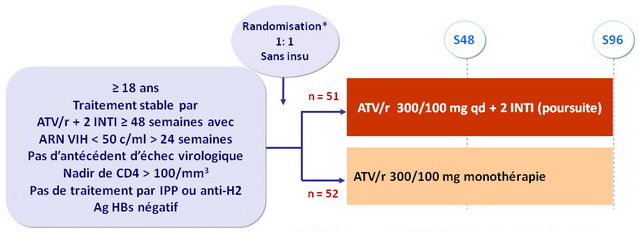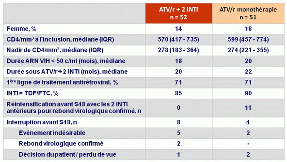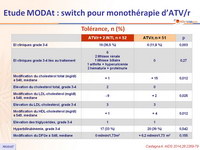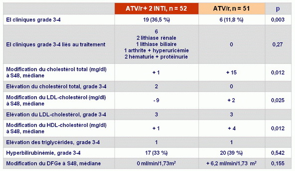 - Evénements indésirables liés au traitement conduisant à l’arrêt : 3 (6 %) dans le bras monothérapie ATV/r vs 11 (21,5 %) dans le bras trithérapie (p = 0,041)
