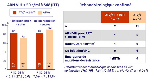 - La simplification par monothérapie d’ATV/r est moins efficace virologiquement que le maintien de la trithérapie en cours par ATV/r + 2 INTI