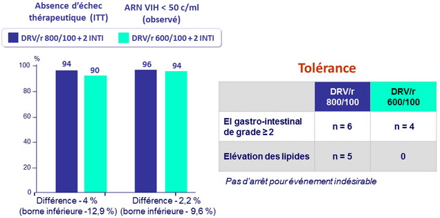 - En raison de la discordance entre les résultats des analyses per-protocole et en intention de traiter, la monothérapie de DRV/r bid n’est pas non inférieure à la trithérapie de DRV/r bid + 2 INTI, chez des patients avec charge virale indétectable sous traitement ARV
