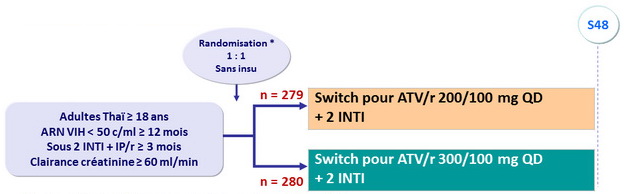 - Secondaires : proportion de patients avec ARN VIH < 50 c/ml à S48, modification CD4, tolérance, événements indésirables, observance,