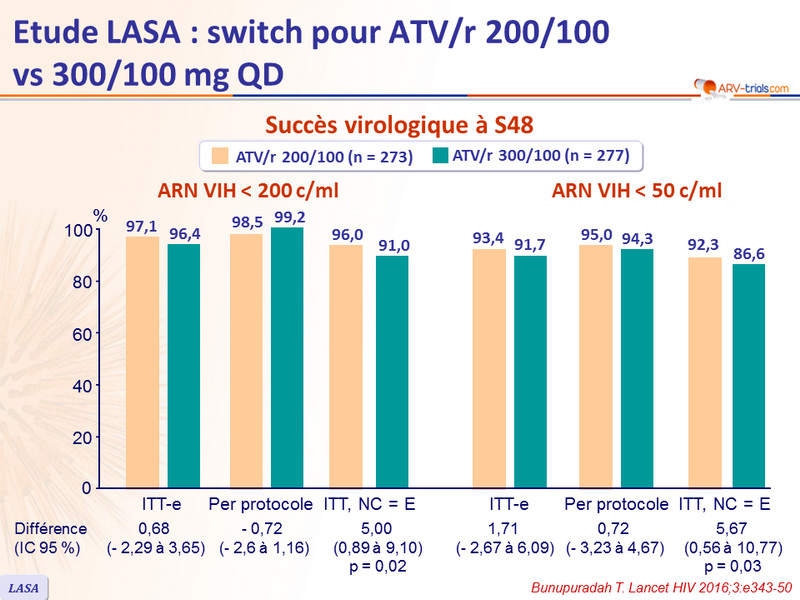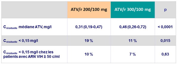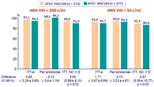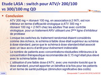 - ATV 200 mg + ritonavir 100 mg, en association à 2 INTI, est non inférieur en terme d'efficacité virologique à ATV 300 mg +