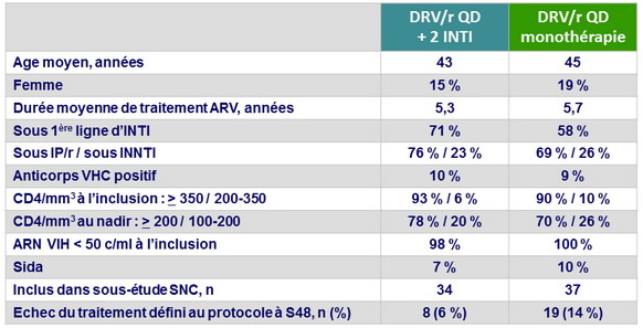 - Pas de différence pour la fonction neurocognitive ou le risque d'événements indésirables neuropsychiatriques entre les bras monothérapie DRV/r et trithérapie DRV/r + 2 INTI