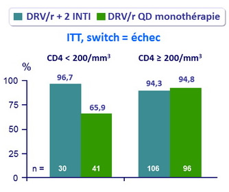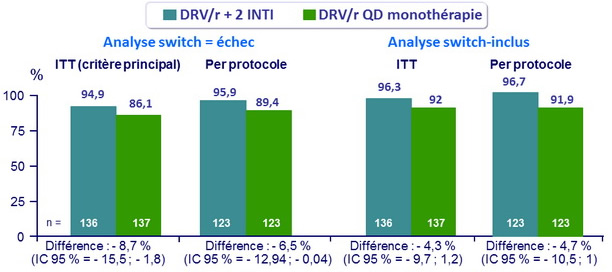 - La monothérapie de DRV/r n'est pas non inférieure à la trithérapie DRV/r + 2 INTI