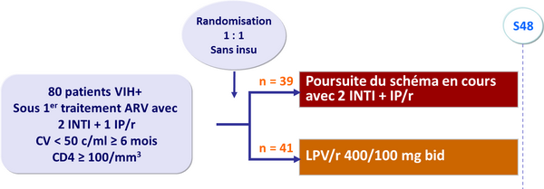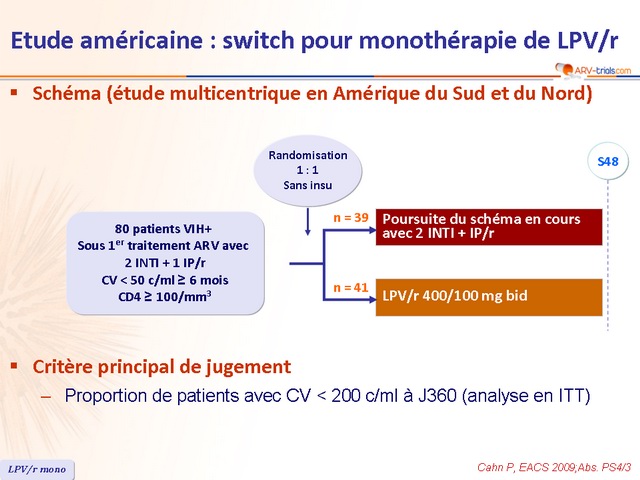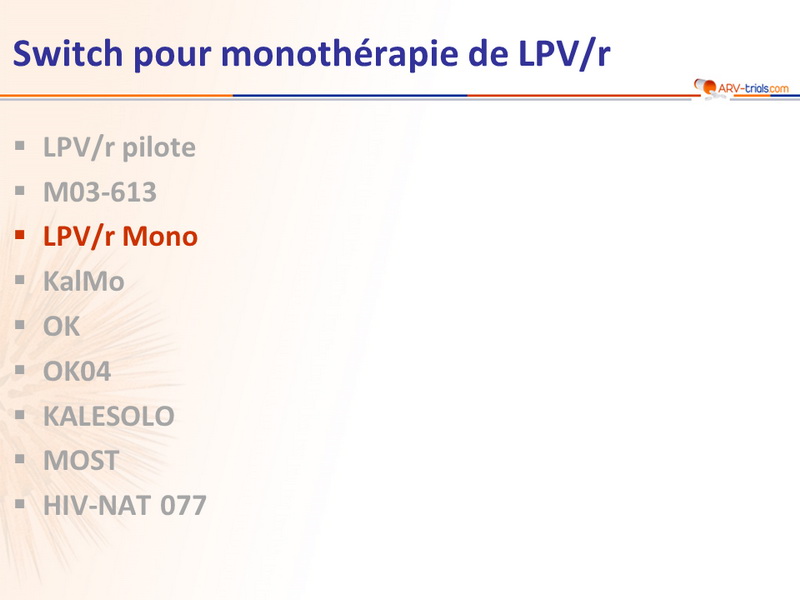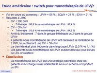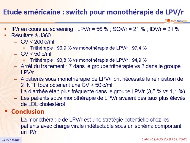 - 4 patients sous monothérapie de LPV/r ont nécessité la réinitiation de 2 INTI, tous obtenant une CV < 50 c/ml