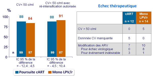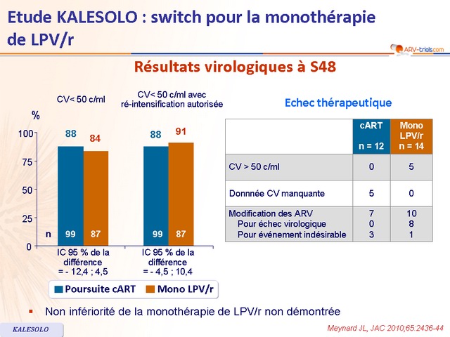 - Non infériorité de la monothérapie de LPV/r pour la proportion de patients avec CV < 50 c/ml à S48 sans modification du traitement (analyse per-protocole) ; limite inférieure de l’IC 90 % bilatéral de la différence = - 12 %, puissance de 80 %