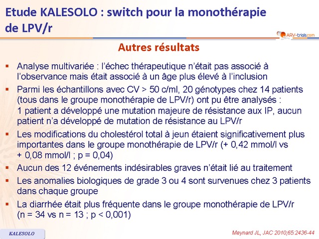 - La diarrhée était plus fréquente dans le groupe monothérapie de LPV/r (n = 34 vs n = 13 ; p < 0,001)