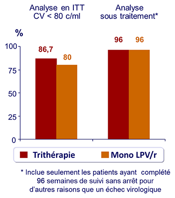 - Principal : proportion de patients avec CV < 80 c/ml à S96 (Analyse en ITT, donnée manquante = échec)