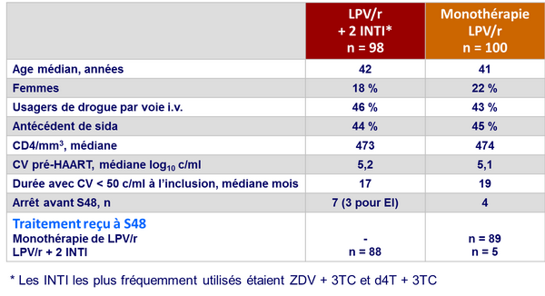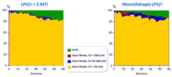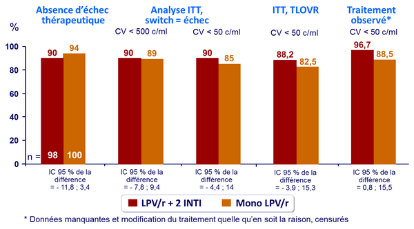 - Non infériorité de la monothérapie de LPV/r pour la proportion de patientsavec échec thérapeutique à S48 (analyse per-protocole) ; limite supérieure de l’IC 95 % de la différence = 12 %, puissance de 80 %
