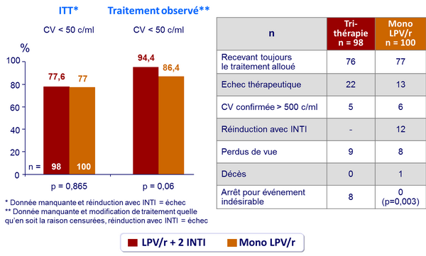 - Chez les patients avec charge virale indétectable depuis plus de 6 mois sous 2 INTI + LPV/r, la monothérapie de LPV/r, suivie d’une réintroduction des INTI si nécessaire, est une stratégie thérapeutique aussi efficace que la poursuite de la trithérapie : non infériorité de la monothérapie démontrée