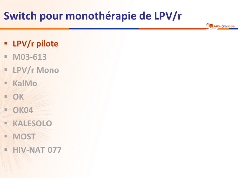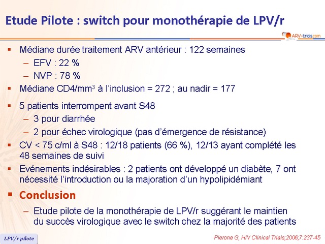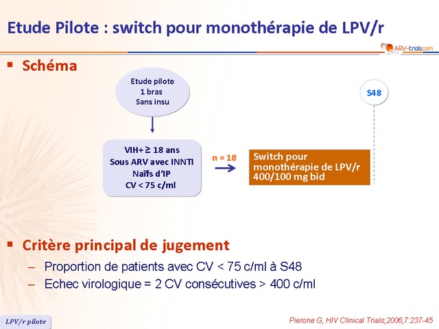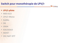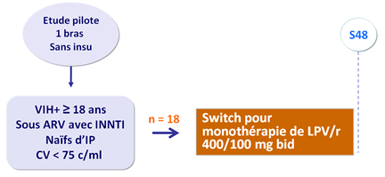 - Etude pilote de la monothérapie de LPV/r suggérant le maintien du succès virologique avec le switch chez la majorité des patients